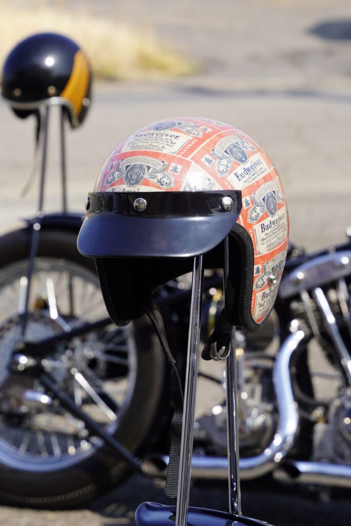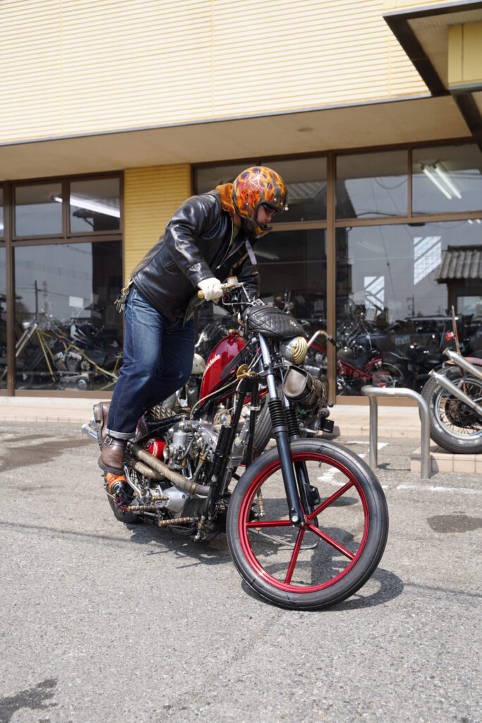 ヘルメットはお二人ともヴィンテージのアイテムをご用意されておりまして、その雰囲気がまた車両と抜群にマッチしておりましたね。さらに、製作させていただいたシーシーバーにさりげなく掛けられている姿もすごく良くて、「ああ、こういう使い方もカッコいいな」とこちらが勉強させていただくような場面でもありました。
