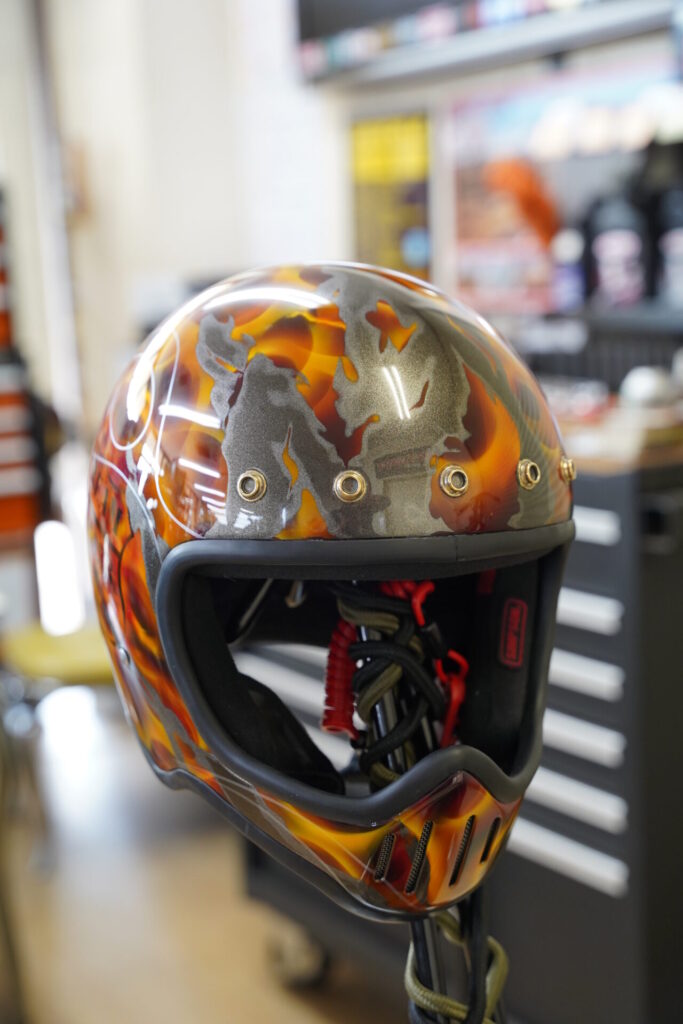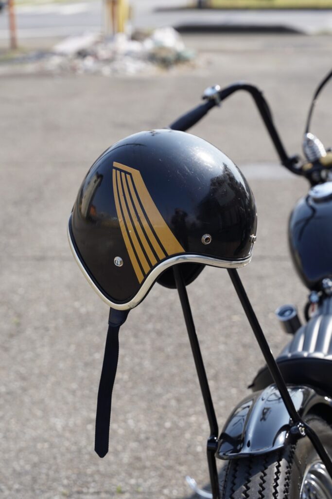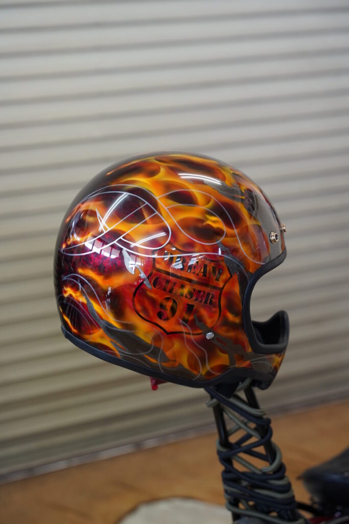 そして今回、パッと目に入って思わず「おっ」となったのがヘルメット。かなり雰囲気のあるカスタムペイントが施されておりまして、これはプロの仕事かな?と思いきや、なんとご友人の方がDIYで仕上げたとのこと。これには正直驚きましたし、バイクだけでなくこういった身の回りのアイテムまで含めて“らしさ”を作り込んでいくのがチョッパーの醍醐味だなと改めて感じました。