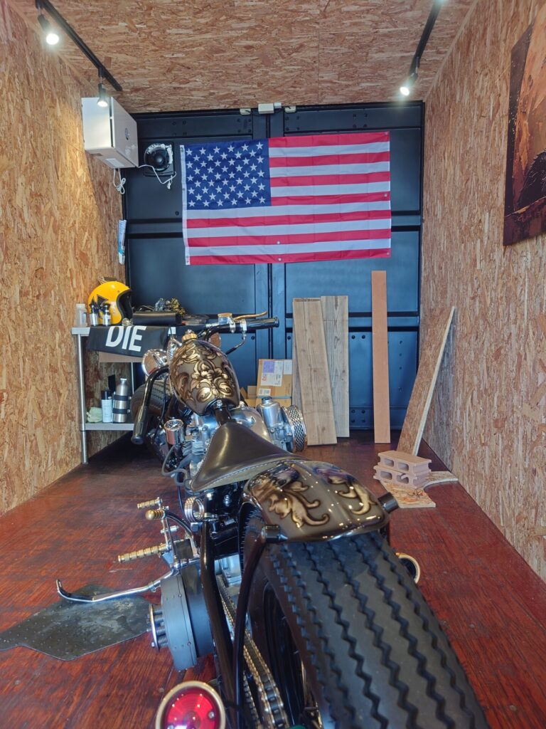 さて、お話は変わりまして、先日出張でメンテナンス させていただいたショベルグース様のガレージが素敵だったので、ちらっとご紹介させてください♪