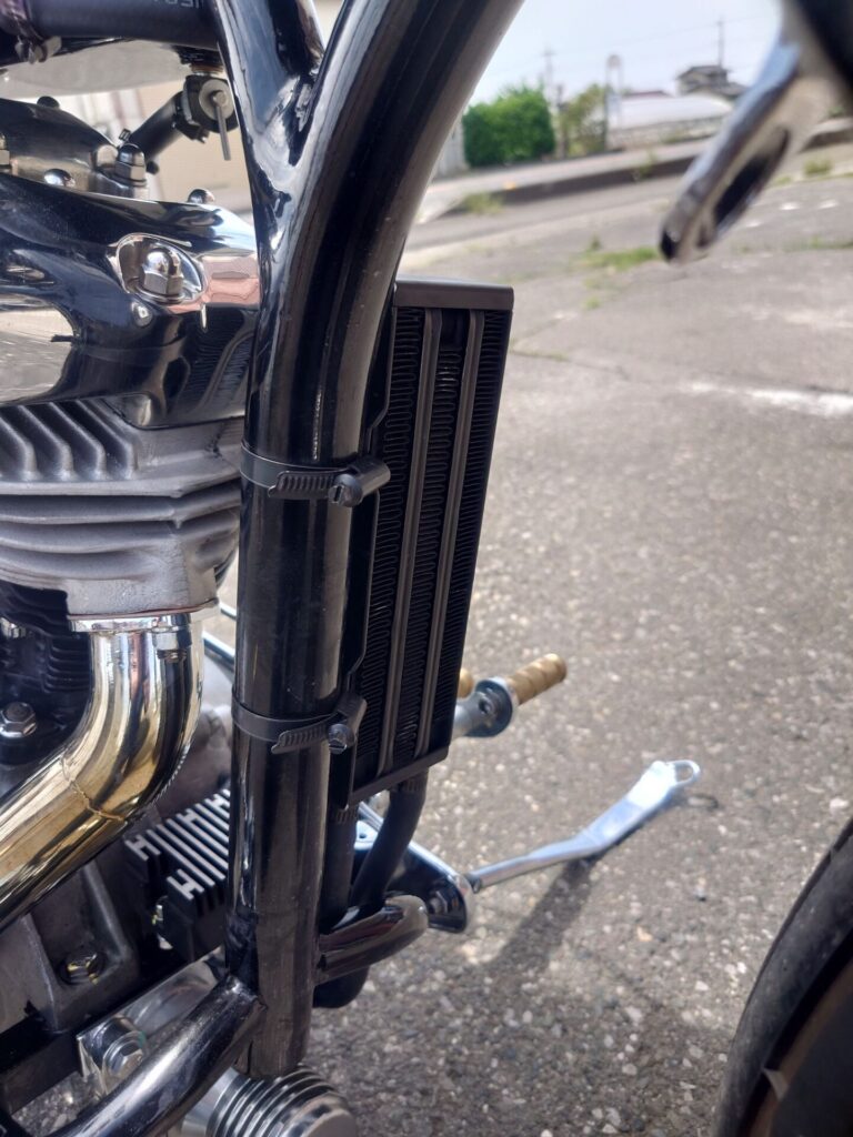 ハンドルには、低めに構えたティラーバーをチョイス。見た目の雰囲気はもちろんですが、実際の乗りやすさも考慮したセッティングで、ディガースタイルでは昔から人気のある形状のひとつです。
