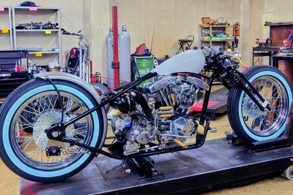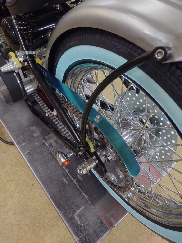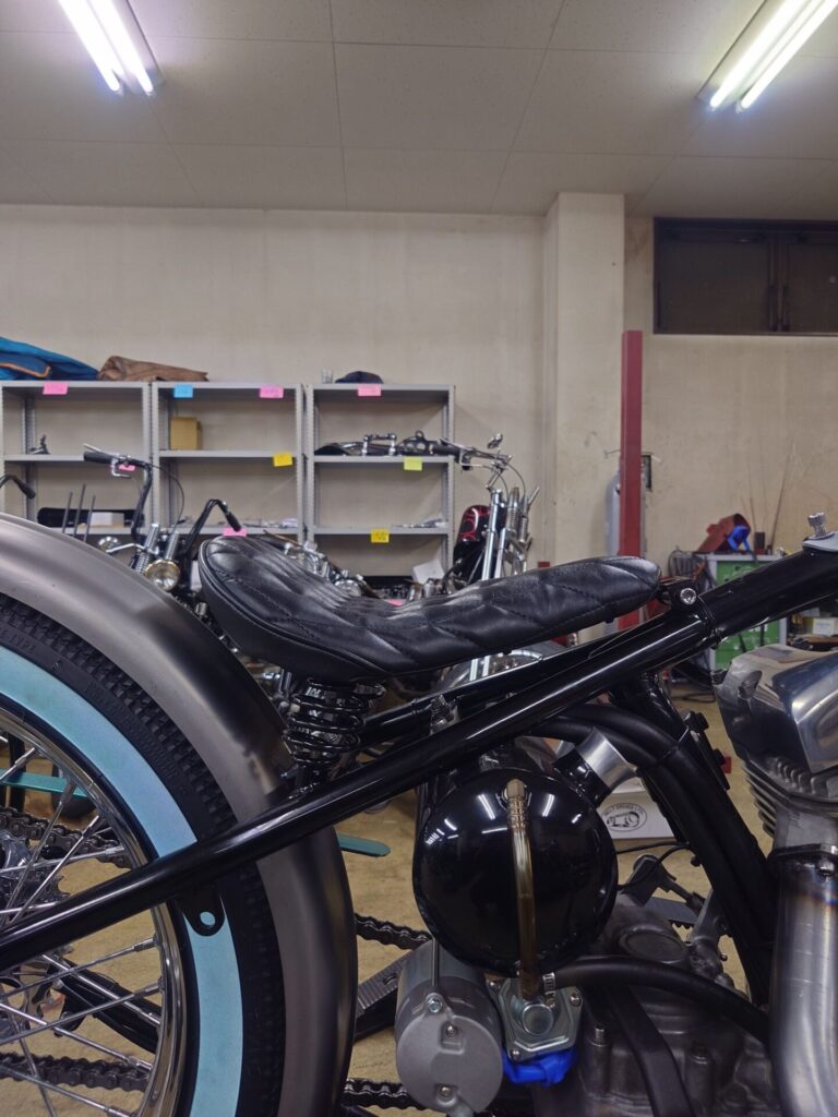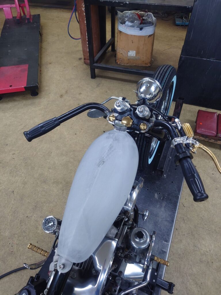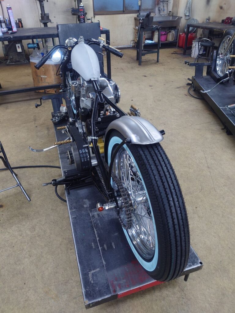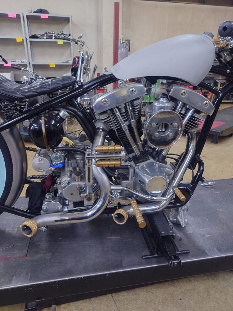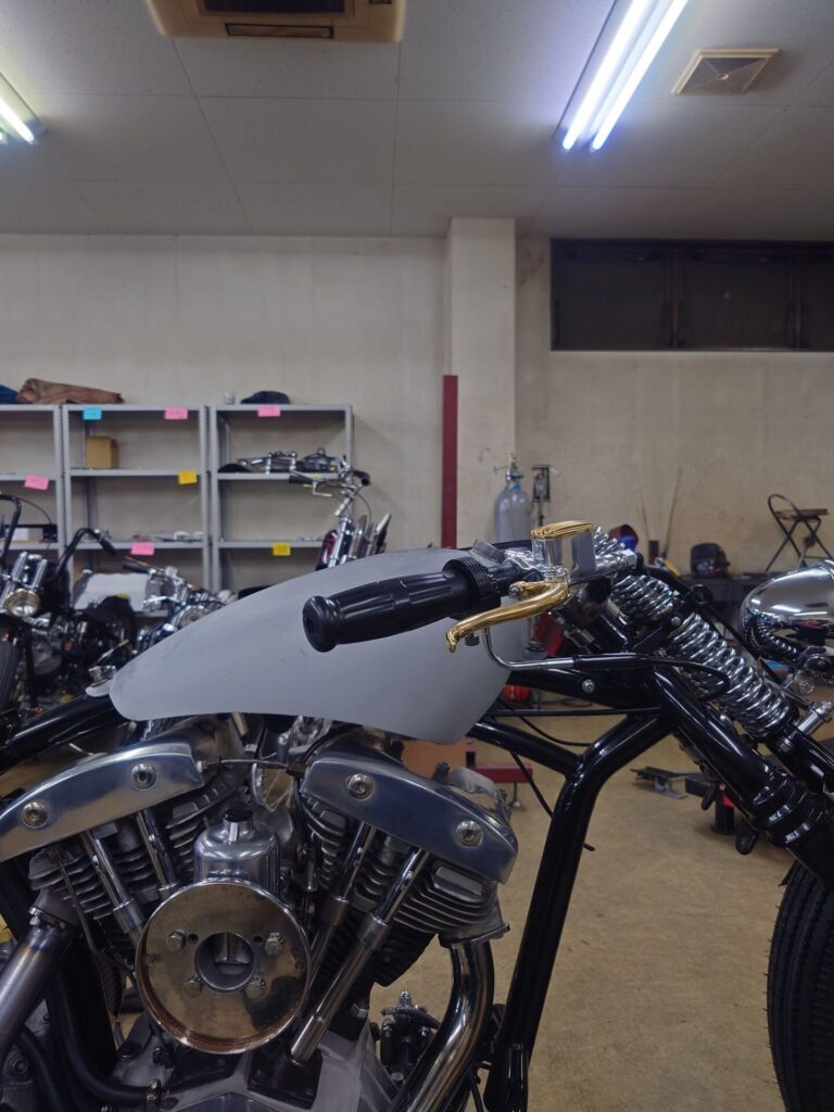 女性オーナー様のショベル・グースボバー。ご依頼内容はかなり濃いカスタムメニューとなっており、ベースの面影が少し残る程度まで手を加えていく予定の一台です。