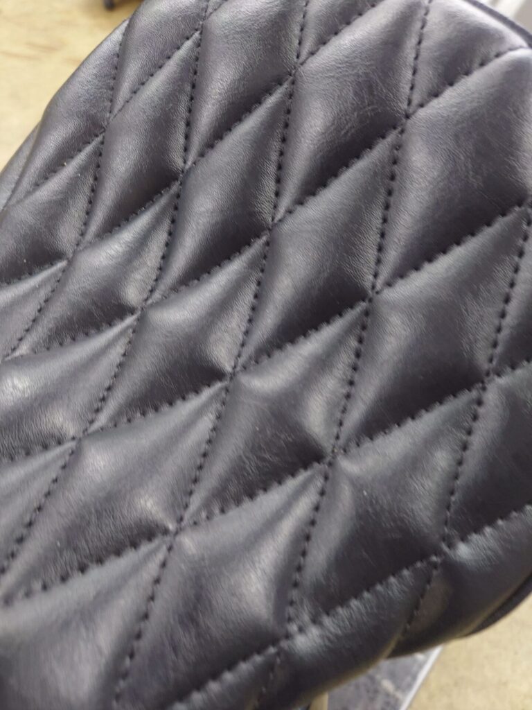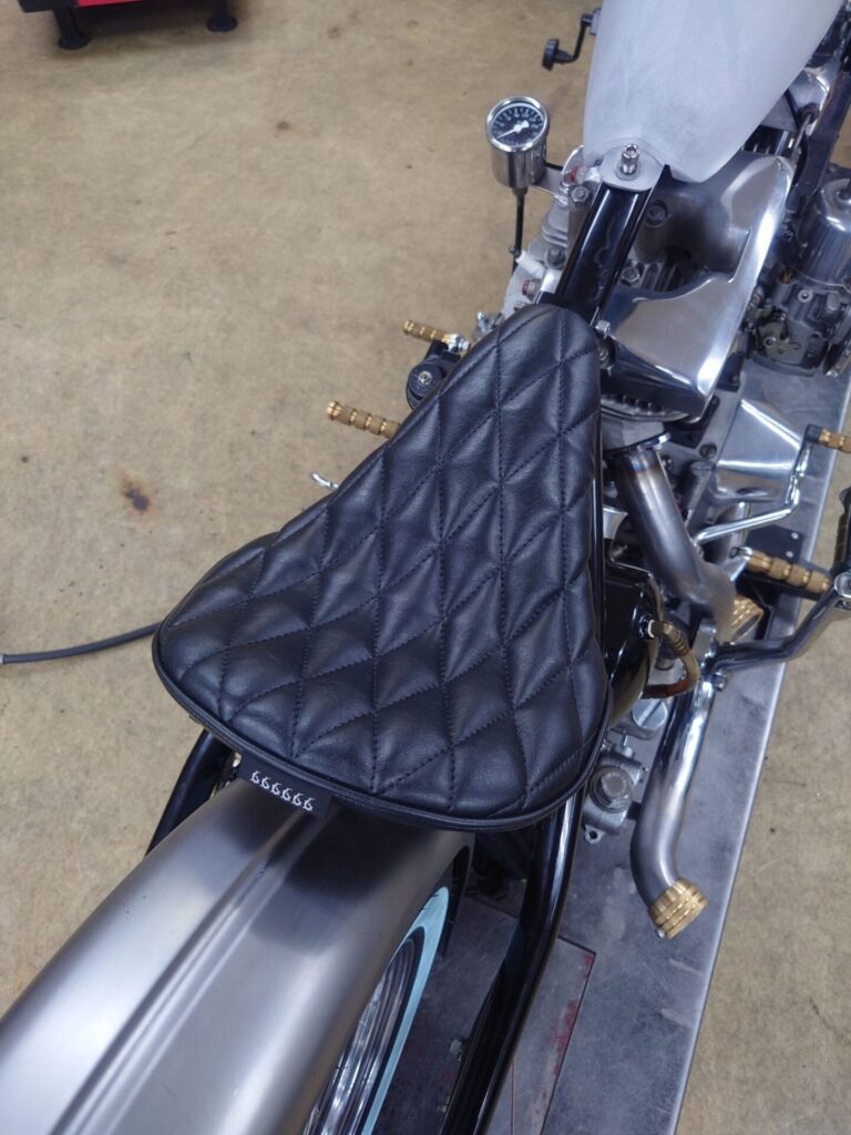 シートには当店オリジナルの新作ソロシートを採用。一般的なものより少し長めのベース形状とし、しっかりとした反り上がりを持たせることで加速時のホールド感を高めています。表皮には本革を使用し、質感・乗り心地ともにこだわった仕上がりです。