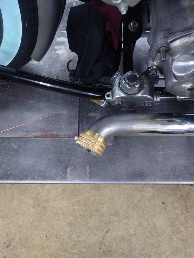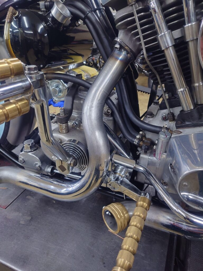 マフラーは当店オリジナルのターンアウト・ショートパイプをベースに、エンド部へ仮の真鍮リングを追加。ターンアウトの角度も45度でも90度でもない、中間的な絶妙なラインでまとめています。今回はミッドコントロール仕様ということもあり、取り回しはかなりタイトに。