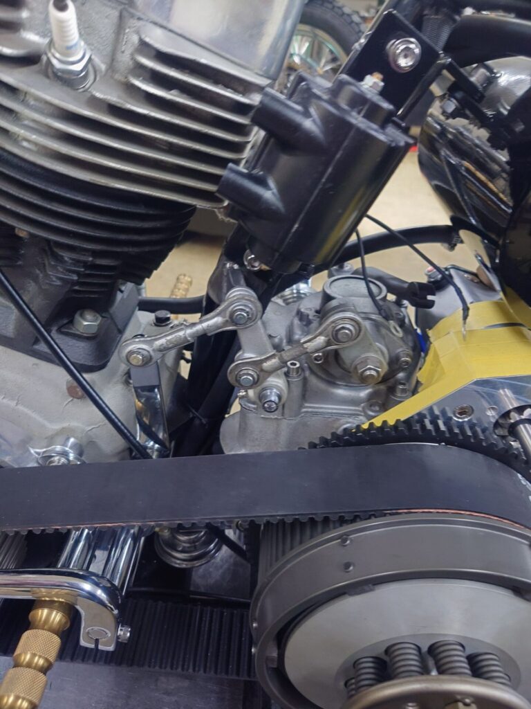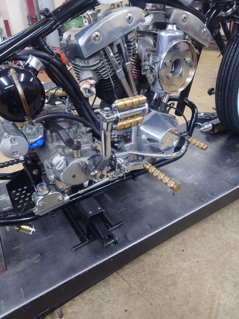 さらにハンドクラッチ化に伴い、純正のシフトリンケージを探して組み付けています。最終的にはオーナー様にまたがっていただき、ペダル位置などを細かく調整していきます。