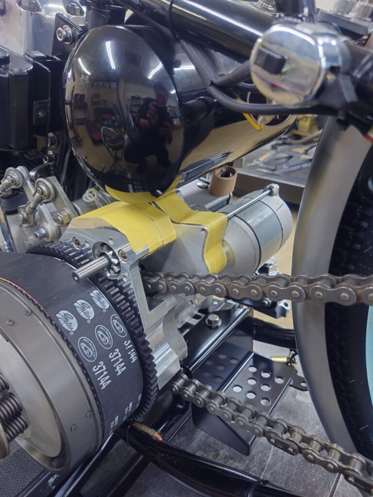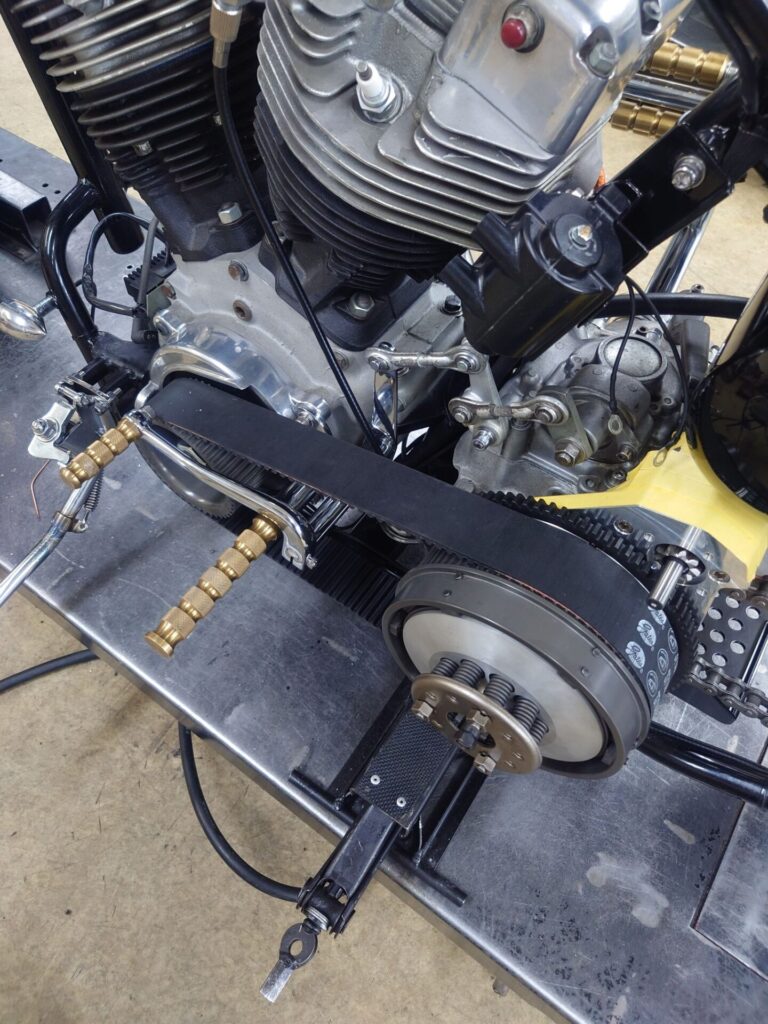 セルスターター追加に伴い、プライマリーは1.5インチから2インチ幅のオープンベルトへ変更し、テックサイクル製スターターキットを採用。ロータリートップミッションの関係でスプロケットは小径化し、チェーン干渉を回避しています。このあたりは当店でもよく行う処理ですが、後々のオイル飛散対策としてチェーンカバーも装着。こちらは真鍮製で、見た目の雰囲気も大切にしています。