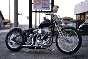 カスタムにてお預かりしているショベルヘッド様は、前後ホイールサイズを変えてガラッと仕様変更しています!