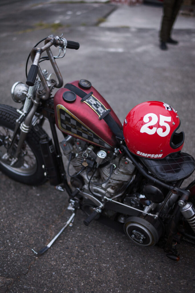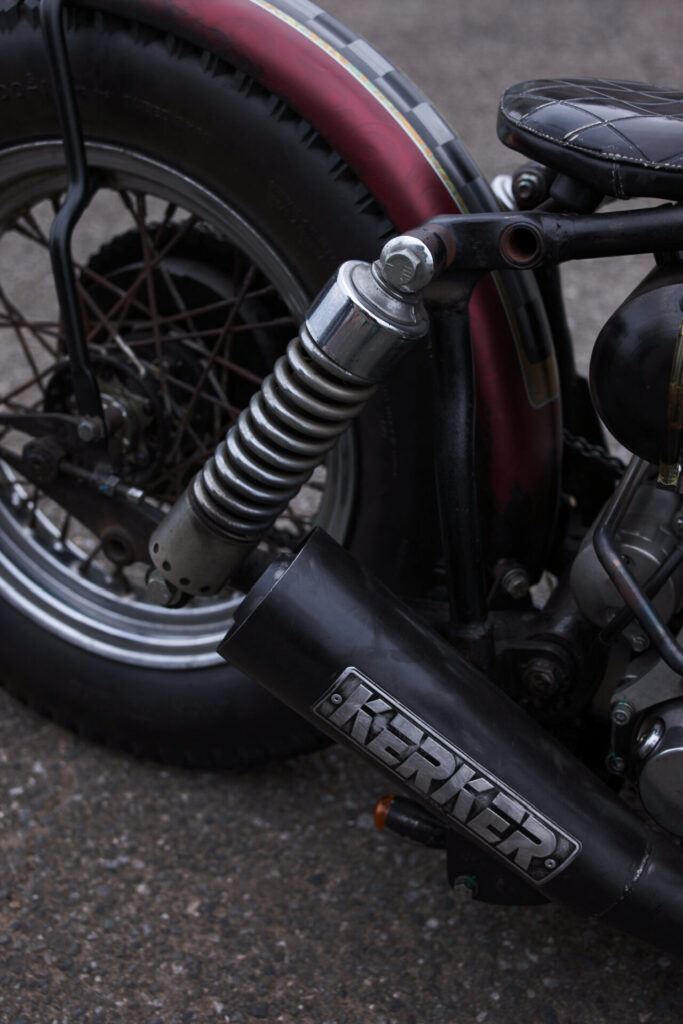 マフラーには、ハーレーカスタムではあまり見かけない「カーカーサイレンサー」を採用。こちらもオーナー様が苦労の末に手に入れたデッドストックのヴィンテージ品です。二輪・四輪どちらのレースにも精通されているオーナー様だからこそのセンスあるチョイスだと感じます。
