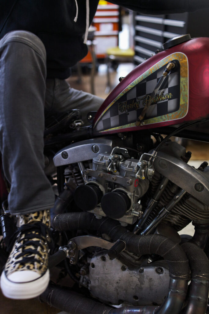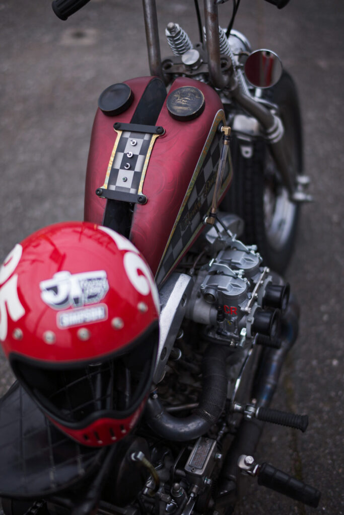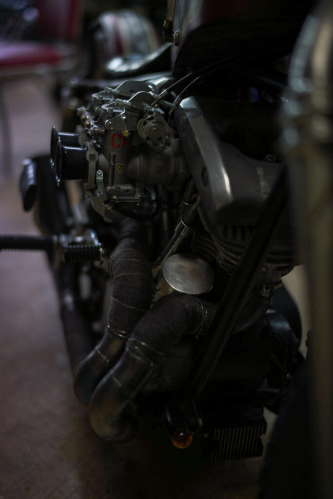 —キャブレターには、ケイヒン製のCRSキャブレターを2連仕様に改造し、セットアップしています。マニホールドはS&S製のツースロートキャブ用をベースに、キャブとの接続部にはマシニングで製作したワンオフアダプターを使用。あえて現代のFCRを使わず、旧型の外観に揃えることで全体の雰囲気を統一しました。