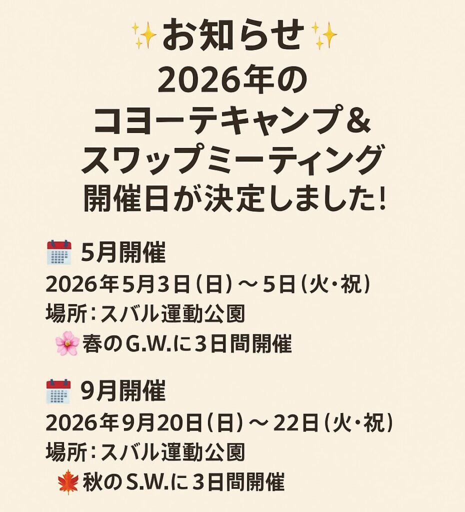 2026年の「コヨーテキャンプ&スワップミーティング」は、5月と9月に2回開催することが決定いたしました。下記の日程で会場を予約することができましたことを皆様にご報告いたします。イレギュラーが発生しない限り、予定通りに開催となります。ツーリングなどのご予定の一部にお役立てして頂けましたら幸いです。